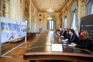 El jefe de Gabinete, Santiago Cafiero; el ministro de Economía, Martín Guzmán, y su par