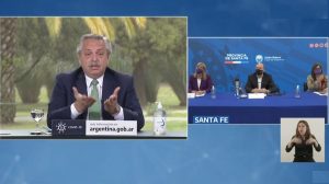 El presidente Alberto Fernández, acompañado por la ministra de Mujeres, Géneros y Diversidad Elizabeth Gómez