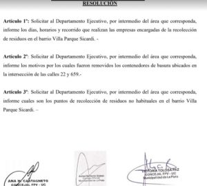 Ante este escenario, el espacio del FdT, el pasado martes, presentó en el Concejo Deliberante un proyecto de resolución para solicitar al Ejecutivo información de los días, horarios y recorrido que realizan las empresas encargadas de la recolección de residuos en el barrio Villa Parque Sicardi; los motivos por los cuales fueron removidos los contenedores de basura ubicados en la intersección de las calles 22 y 659 de Sicardi; y cuales son los puntos de recolección de residuos no habituales.