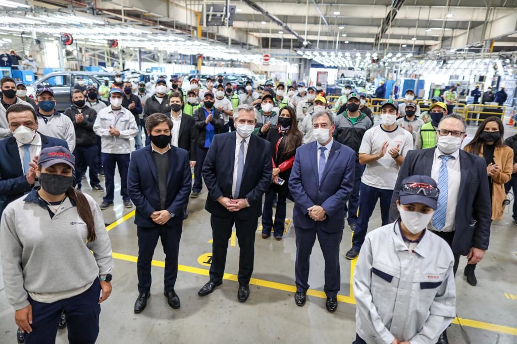 El presidente Alberto Fernández visitó, en el municipio bonaerense de Zárate, la planta automotriz de Toyota que retomó su actividad productiva bajo un estricto protocolo sanitario, en el marco de la pandemia de coronavirus COVID-19. Estuvo acompañado por el gobernador de Buenos Aires, Axel Kicillof.