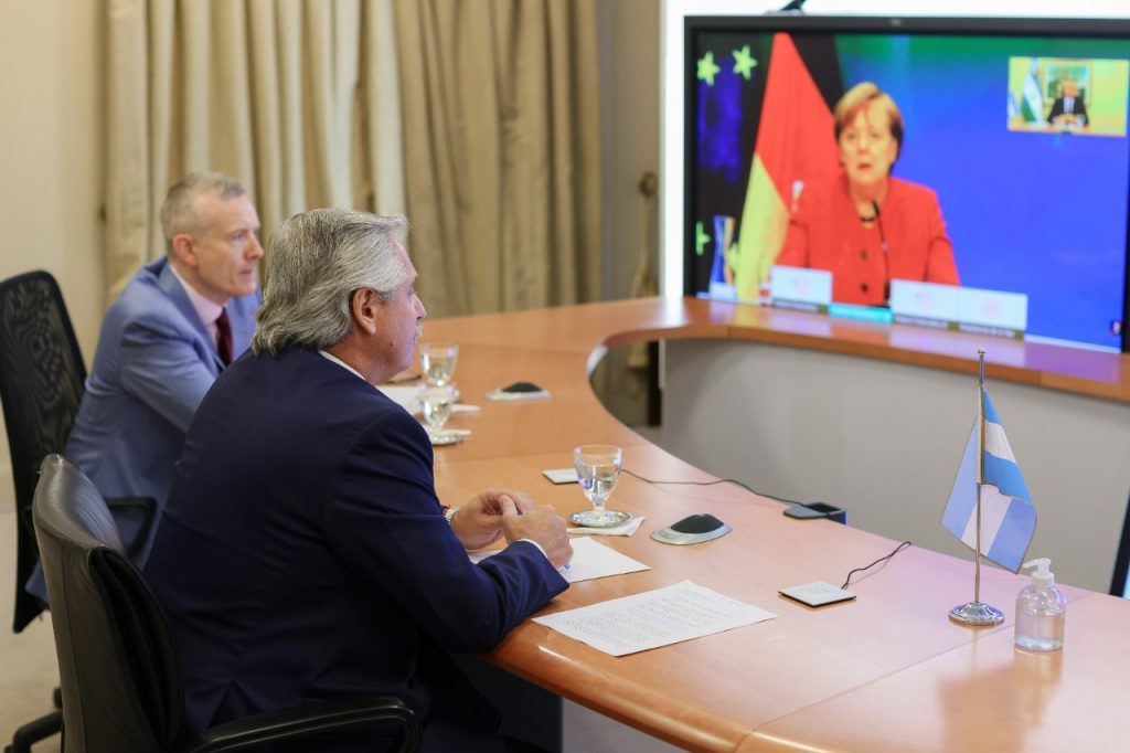 El presidente Alberto Fernández mantuvo en el mediodía del lunes desde la Residencia Presidencial de Olivos una videoconferencia con la canciller de Alemania, Angela Merkel.
