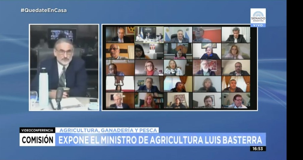 El ministro de Agricultura, Ganadería y Pesca, Luis Basterra, participó de una videoconferencia con la Comisión de Agricultura, Ganadería y Pesca del Senado de la Nación, que preside Adolfo Rodríguez Saá, del Frente de Todos, acompañado por Alfredo De Ángeli, de Juntos por el Cambio, como Vicepresidente.