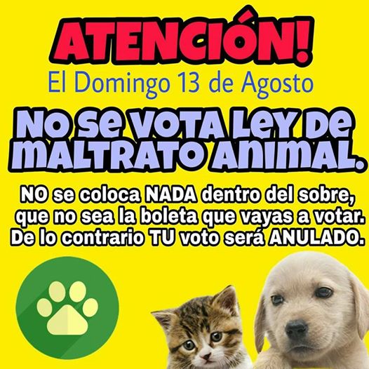 Los mensajes que circulan llaman a introducir con el voto una boleta a favor de una ley que penaliza el maltrato animal. «El día de las elecciones se puede pedir la cartilla para votar contra el maltrato animal y para sancionar a quienes lo practican. Con solo 5000 votos se aprueba la ley!. Difundir este mensaje por favor. Ellos no hablan pero estamos nosotros para hacerlos respetar», dicen las imágenes que lo acompañan.