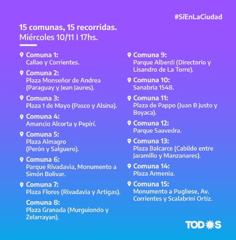 Bajo la consigna «15 comunas, 15 recorridas», se encontrarán en distintas plazas de la Ciudad y saldrán a caminar por los barrios para «escuchar a los vecinos, acercarles las propuestas del espacio y la boleta del Frente de Todos para el próximo domingo», según indicaron.