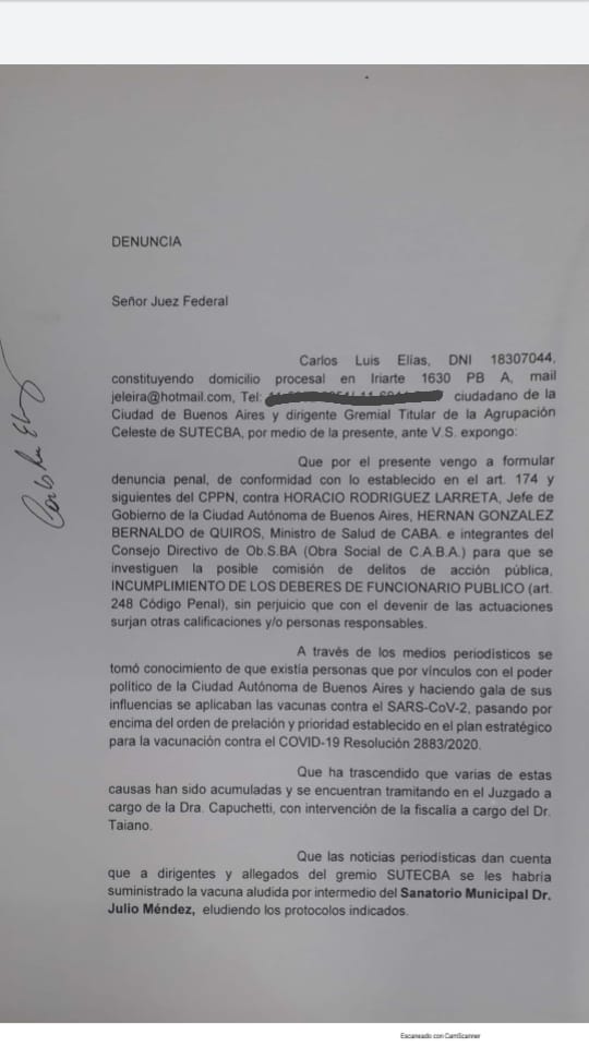 Una de las denuncias, a la que accedió Informe Político, la presentó Carlos Elías, referente de la Agrupación Celeste de SUTECBA, a raíz de la versión que indica que tanto Amadeo Genta, secretario general del mencionado sindicato, y su hijo Emiliano, quien aspira a sucederlo, se habrían vacunado de manera irregular en el Sanatorio Dr. Julio Méndez, dependiente de OBSBA (Obra Social de la Ciudad de Buenos Aires).