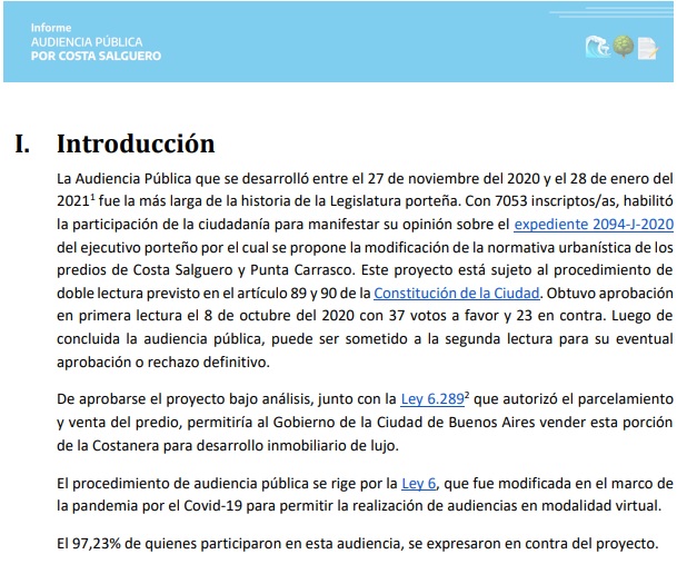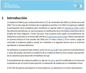 Difundido por la legisladora porteña Lucía Cámpora, el documento hace hincapié en la gran participación ciudadana que suscitó la iniciativa y que «la abrumadora mayoría de los participantes se manifestó en contra del proyecto y a favor de la construcción de un parque público».