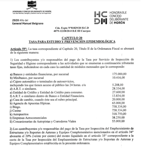 Por este caso en 2018 se inició una acción judicial por el costo de la tasa, que hoy está en la CSJP (Corte suprema de justicia de la provincia). Hay más. En pleno 2025, y a pesar de que la emergencia sanitaria por la pandemia de COVID terminó en mayo de 2023, el municipio de Morón sigue cobrando una “Tasa Municipal por COVID-19”. La tasa se creó en 2020 por ordenanza municipal y sigue vigente, aunque no hay pandemia. En 2024, el costo mensual de la tasa de COVID en Morón era de $2.036.508 por sucursal. (ver imágenes al final)