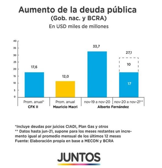 El gráfico que pusieron a circular desde Juntos por el Cambio, que es el que Macri está utilizando en sus recientes presentaciones televisivas, en el marco de su incorporación a la campaña electoral opositora, aclara que «incluye deudas por juicios CIADI, Plan Gas y otros» (que no se especifican).