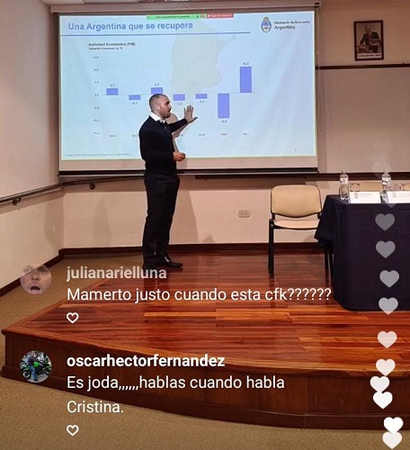 Las primeras intervenciones en el vivo de Instagram de Guzmán fueron, mayoritariamente en contra del ministro y en el mediodía del sábado, fueron desactivados los comentarios debajo de la grabación de la conferencia, que quedó colgada como posteo en la cuenta del economista platense, uno de los destinatarios del discurso de Cristina.