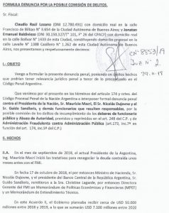 De acuerdo a la acusación, el jefe de Estado junto a otros funcionarios cometió una serie de posibles ilícitos vinculados al acuerdo financiero realizado entre Argentina y el Fondo Monetario Internacional. El préstamo solicitado por el Gobierno argentino fue aceptado por el organismo internacional en octubre del 2018, por un total de 57 mil millones de dólares.