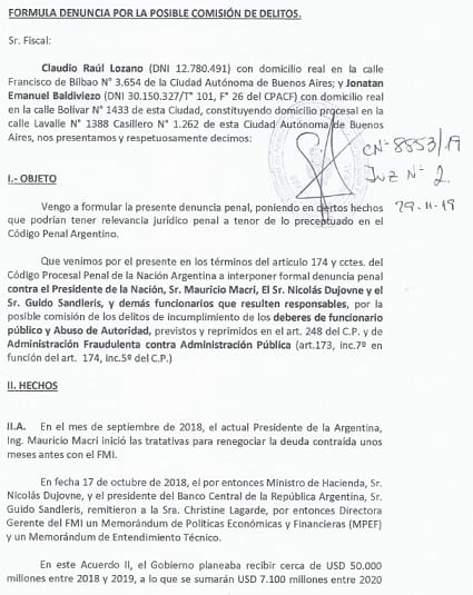 La denuncia radicada por el economista es extensiva al exministro de Hacienda, Nicolás Dujovne, y al presidente del Banco Central de la República Argentina (BCRA), Guido Sandleris, así como también a todos los “funcionarios que resulten responsables” de una serie de presuntos delitos vinculados al préstamo solicitado por el Gobierno Nacional durante el año pasado.