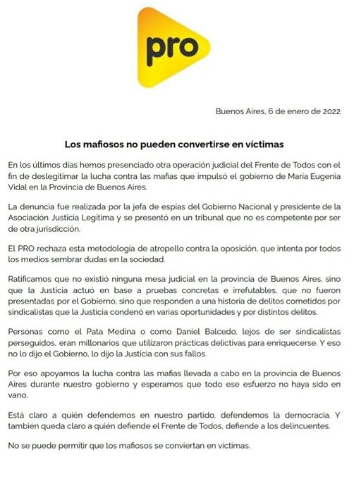«En los últimos días hemos presenciado otra operación judicial del FdT con el fin de deslegitimar la lucha contra las mafias que impulsó el Gobierno de Vidal en PBA. El PRO rechaza esta metodología de atropello contra la oposición», detalla el comunicado.