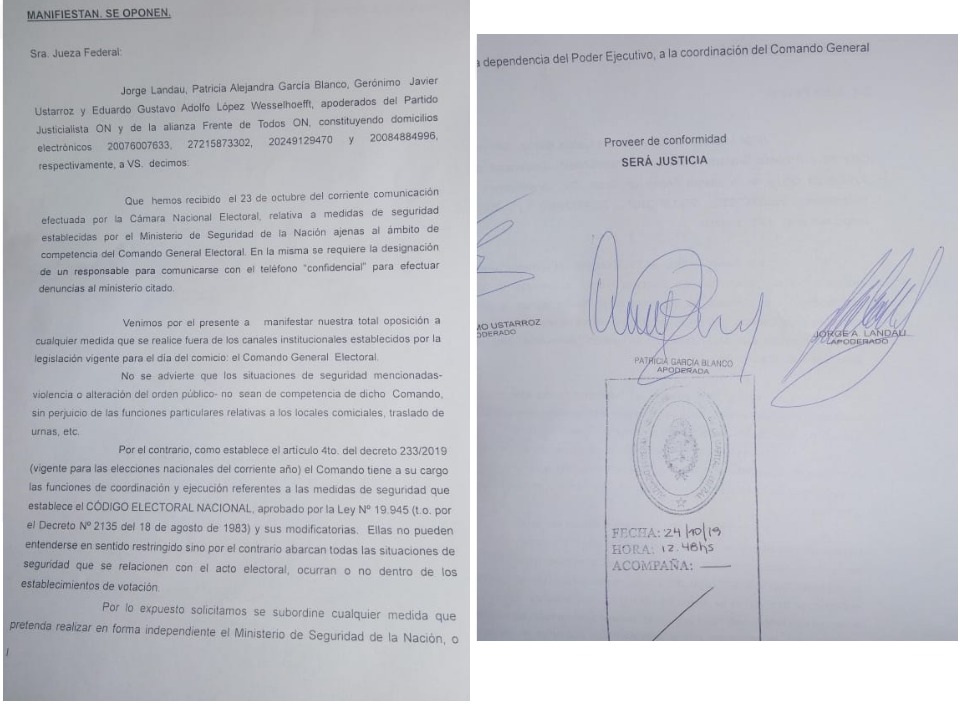 De acuerdo al apoderado Jorge Landau, el Poder Ejecutivo ordenó «un sistema de seguridad paralelo que relativiza la función del personal de seguridad que tradicionalmente está a cargo del comicio, generando las confusiones y los conflictos propios de esta tareas superpuestas donde además se confunde a la población».