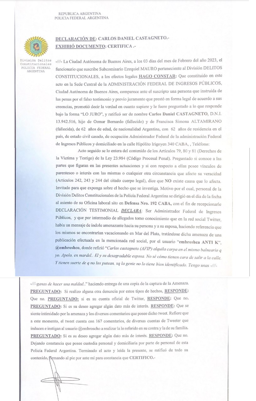 A través de diferentes cuentas en la red social Twitter, el titular de la Administración Federal de Ingresos Públicos (AFIP), Carlos Castagneto, recibió una serie de amenazas que además de incitar a cometer actos de violencia contra él y su familia, incluyen información sobre el lugar donde veranea desde hace 30 años.