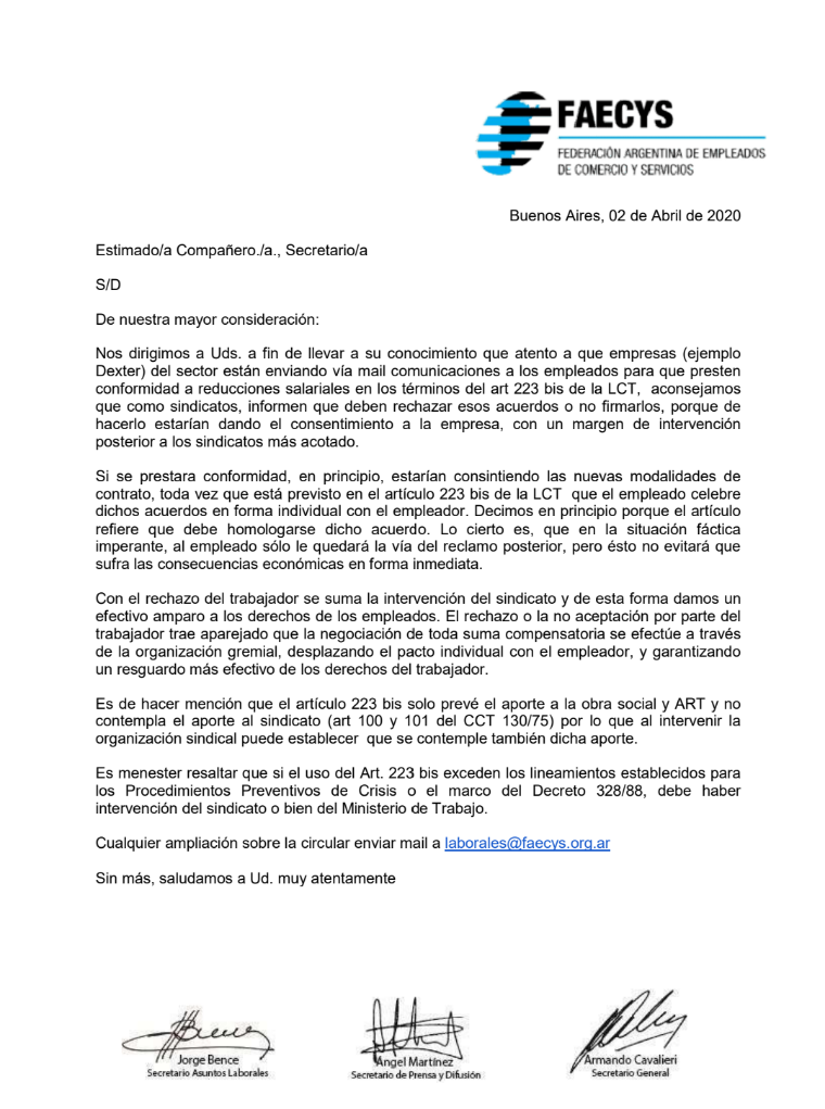 Trascendió en este sentido, un pedido a los sindicatos de la actividad de todo el país, para que no acepten recibir presiones de las empresas que quieren obligar a los trabajadores a negociar individualmente su vínculo laboral. Una circular interna de la federación nacional mercantil (FAECYS), da cuenta de ello en la necesidad también de no perder aportes de la masa asalariada en medio del grave contexto general.