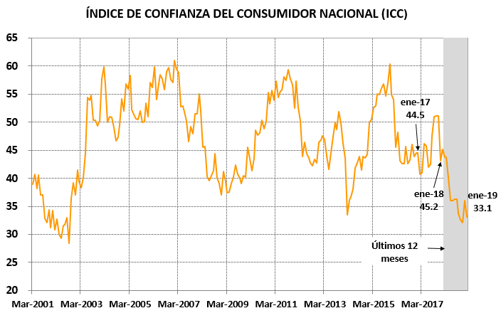 Según el Índice de Confianza del Consumidor, elaborado mensualmente por el Centro de Investigación en Finanzas (CIF), de la Escuela de Negocios de la Universidad Torcuato Di Tella, ésta retrocedió un 8% en el mes de enero, acumulando una caída de 26,7% respecto del mismo mes del año anterior y ubicándose en uno de los puntos más bajos de la serie desde el año 2002.