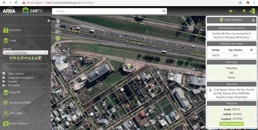 En enorme edificio ubicado sobre la colectora de Panamericana y la Calle 12 de agosto, a la altura de Del Viso, figura en mora tanto para los impuestos provinciales, recaudados por ARBA, como para los municipales, a cargo de la propia municipalidad de Pilar.