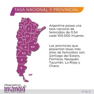 Según el «Observatorio Mumalá», desde el 1º de enero al 30 de agosto de este año se cometieron 142 femicidios. El 62% ocurrieron dentro de la vivienda de la víctima o compartida, a su vez la edad promedio de las víctimas es de 39 años. Por su parte, las provincias que presentan mayor tasa de femicidios son Santiago del Estero, Formosa, Neuquén, Tucumán, La Rioja, Salta y Chaco; todas ellas, superan ampliamente la tasa nacional de femicidios.