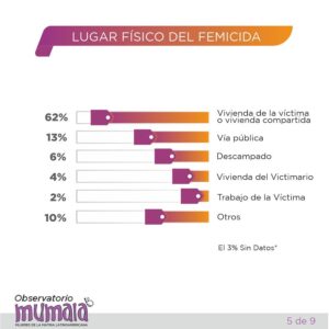 Los datos nos vuelven a confirmar que quienes dicen amarnos son quienes nos matan, ya que en el 64,5% de los casos el femicida fue la pareja o ex pareja de la víctima. Respecto del lugar donde ocurrió el femicidio, en el año 2020 el 65% tuvo lugar en la vivienda de la víctima por lo que, como venimos señalando, el hogar no es un lugar seguro para las mujeres en situación de violencia.