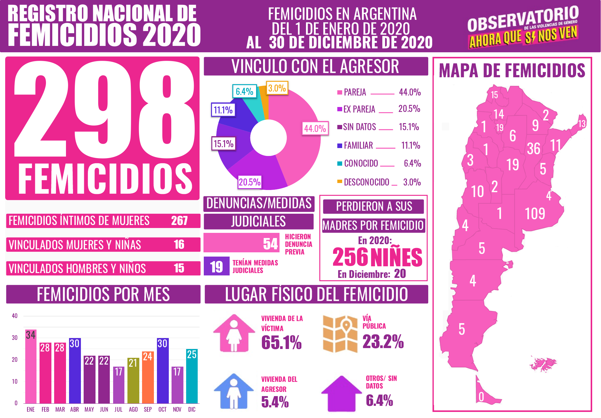 En relación con lo anterior, en 2020 la pandemia no frenó los asesinatos por razones de género. Según el análisis de medios gráficos y digitales realizado por el «Observatorio Ahora que sí nos ven», del 1 de enero al 30 de diciembre, ocurrieron 298 femicidios. Lo que equivale a una mujer asesinada cada 29 horas.