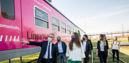 Gómez Alcorta y Meoni presentaron la campaña de difusión de la Línea 144 en los trenes argentinos