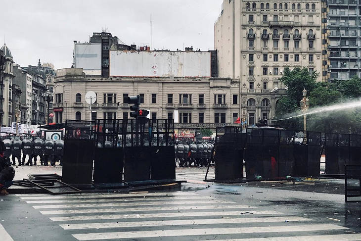 La Policía decidió responder para despejar los disturbios con un camión hidrante. Acto seguido, arrojó gases lacrimogenos lo que provocó que las personas se replegaran hacia la calle Paraná mientras algunos manifestantes tiraron baldosas contra la línea de efectivos que se montó sobre avenida Entre Ríos.