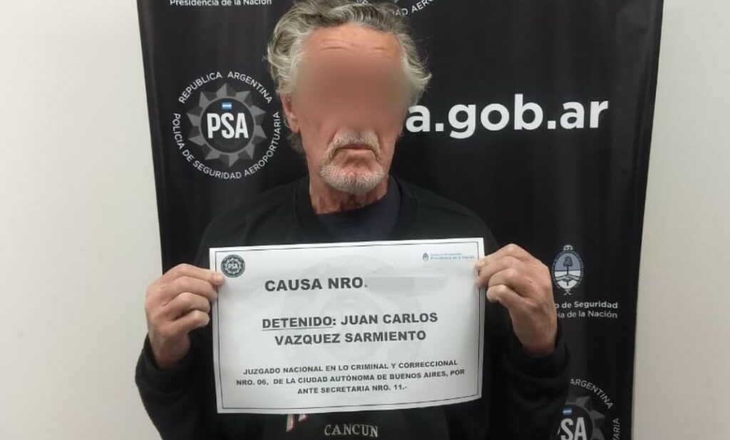 La Policía de Seguridad Aeroportuaria (PSA), que depende del Ministerio de Seguridad de la Nación a cargo de Aníbal Fernández, confirmó que el pasado jueves fue detenido el represor Juan Carlos Vázquez Sarmiento, prófugo de la Justicia desde el 4 de marzo de 2002, cuando supo que lo estaban investigando por la apropiación del nieto restituido 102 y se pidió su captura para tomarle declaración indagatoria.