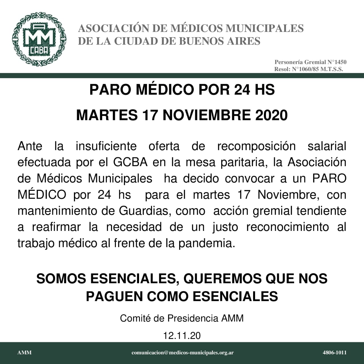 Los doctores indicaron que su medida de fuerza será de un día con mantenimiento de las guardias, «como acción gremial tendiente a reafirmar la necesidad de un justo reconocimiento al trabajo médico frente a la pandemia».