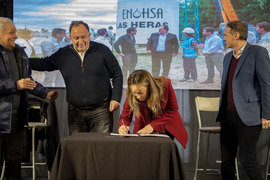 La presidenta de AySA, Malena Galmarini, firmó de un convenio de colaboración técnica con el municipio de Gral. Las Heras y de la inauguración de la “Ampliación de Agua Potable y Sistemas de Producción y Almacenamiento General Hornos”, junto al ministro de Obras Públicas de la Nación, Gabriel Katopodis; el intendente local, Javier Osuna y el Subadministrador de ENOHSA, Néstor Álvarez.