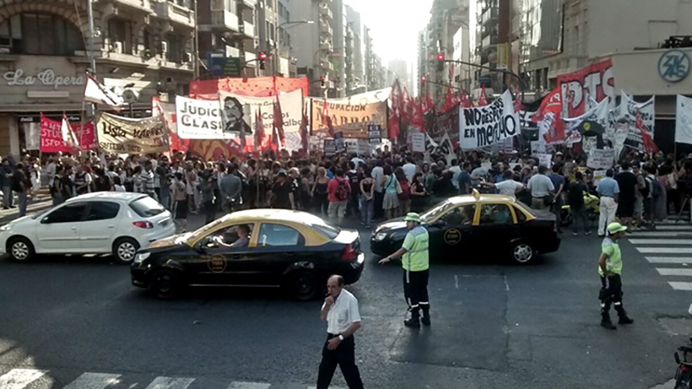 La columna de manifestantes arribó cerca del mediodía a la sede ubicada en la calle Uspallata al 3100, en el barrio de Parque Patricios, luego de haber realizado un corte, a primera hora de la mañana, en la esquina de las avenidas Callao y Corrientes.