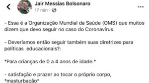 A través de una serie de twitts, que luego tuvo que borrar, el presidente de Brasil Jair Bolsonaro acusó a la OMS de “incentivar la masturbación en niños” mientras en su país siguen creciendo los contagios y muertos por el coronavirus.
