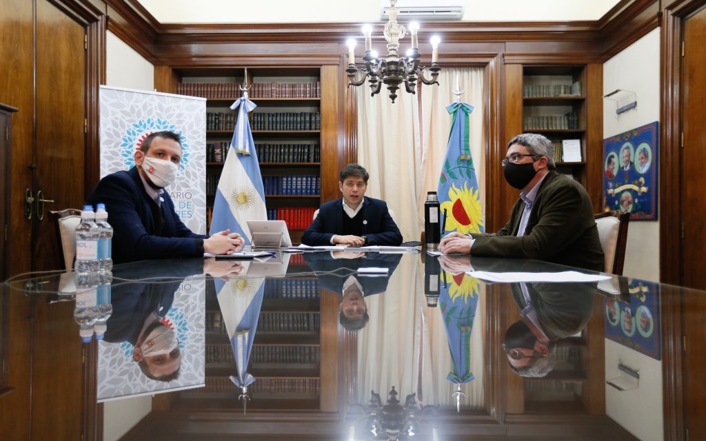 El gobernador de la provincia de Buenos Aires, Axel Kicillof, y el presidente del Banco Provincia, Juan Cuattromo, encabezaron este jueves el primer encuentro “Vincular” del Bapro, un espacio de reuniones comerciales virtuales creado para potenciar las exportaciones bonaerenses y brindar a las empresas nuevas oportunidades de negocios en mercados vecinos, como Brasil, Uruguay y Chile. Participaron también el ministro de Desarrollo Agrario, Javier Rodríguez; el ministro de Producción, Ciencia e Innovación Tecnológica, Augusto Costa; el embajador argentino en Brasil, Daniel Scioli; y el subsecretario de Promoción del Comercio e Inversiones, Pablo Enrique Sívori.