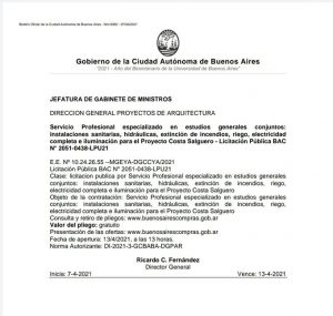 La presentación de las ofertas se dará a conocer en www.buenosairescompras.gob.ar y la fecha de apertura será el 13/4/2021, a las 13 horas.