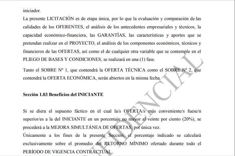 En otro apartado del pliego, se deja constancia que “la presente convocatoria se realiza a partir del proyecto de inversión y desarrollo comercial presentado por el INICIANTE. Sin perjuicio de ello, la convocatoria a presentar ofertas es abierta a todos los INTERESADOS que cumplan con las condiciones para ser OFERENTE. Se acordará al INICIANTE la preferencia que se detalla en el Sección 1.03, por su carácter de 6 iniciador”.