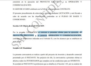 PROYECTO EJECUTIVO y su posterior OPERACIÓN Y COMERCIALIZACIÓN» pero existen particularidades: se le da a una empresa inexistente, a la que llama «Iniciadora», la potestad de igualar una oferta 20% superior.