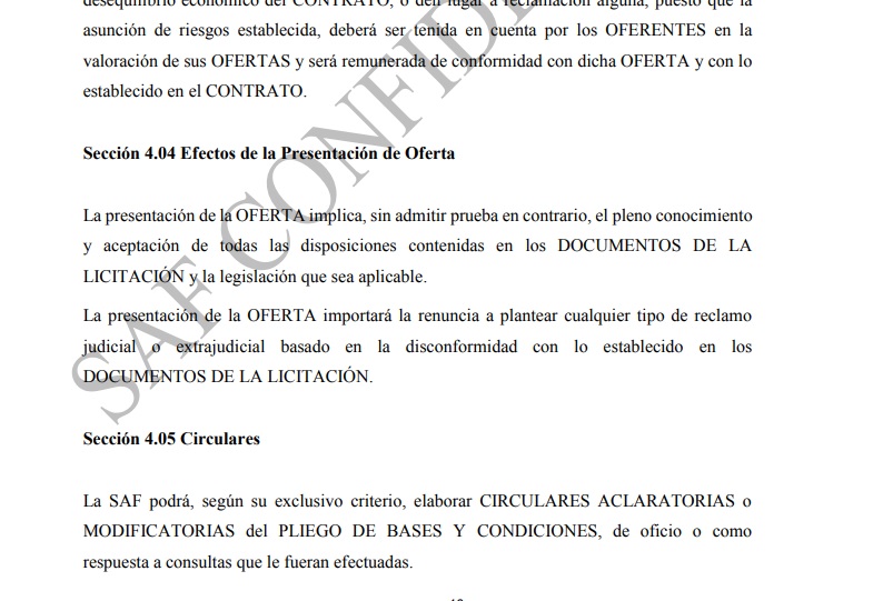 Si aun así esa empresa pierde, el que gana tiene que pagarle 500 mil dólares. A lo largo de 45 hojas, que llevan una marca de agua que indica «SAF Confidencial», no se da cuenta quién es la empresa, qué propuesta previa le llevo, dónde está radicada ni ningún detalle.