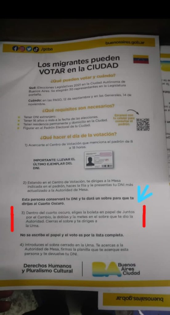 Bajo el título «los migrantes pueden votar en la Ciudad», en el volante se precisan los requisitos y qué hacer el día de la votación para el migrante. Luego, existe un apartado polémico que señala: «Dentro del cuarto oscuro eliges la boleta de Juntos por el Cambio, la doblas y la metes en el sobre que te dio la Autoridad. Cierras el sobre y te diriges a la urna».