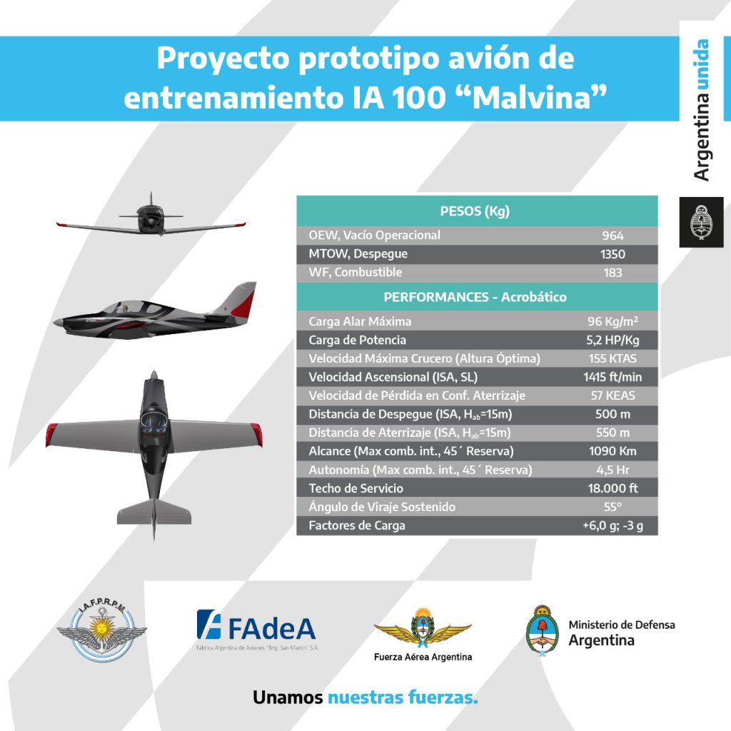 El ministro de Defensa, Agustín Rossi, anunció que la Argentina comenzará a fabricar un nuevo avión de entrenamiento militar y uso civil primario. Se trata del IA-100 «Malvina», que será producido por la Fábrica Argentina de Aviones S.A. (FADEA) y financiado a través del Instituto de Ayuda Financiera (IAF).