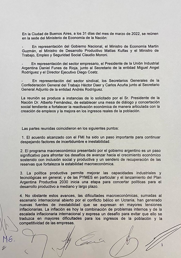 «Las partes podrán plantear medidas coyunturales y estructurales para mejorar la situación productiva del país, promoviendo más inversión pública y privada, con más competitividad y exportaciones, así como la generación de trabajo productivo y formal», señala el documento entre otros puntos.