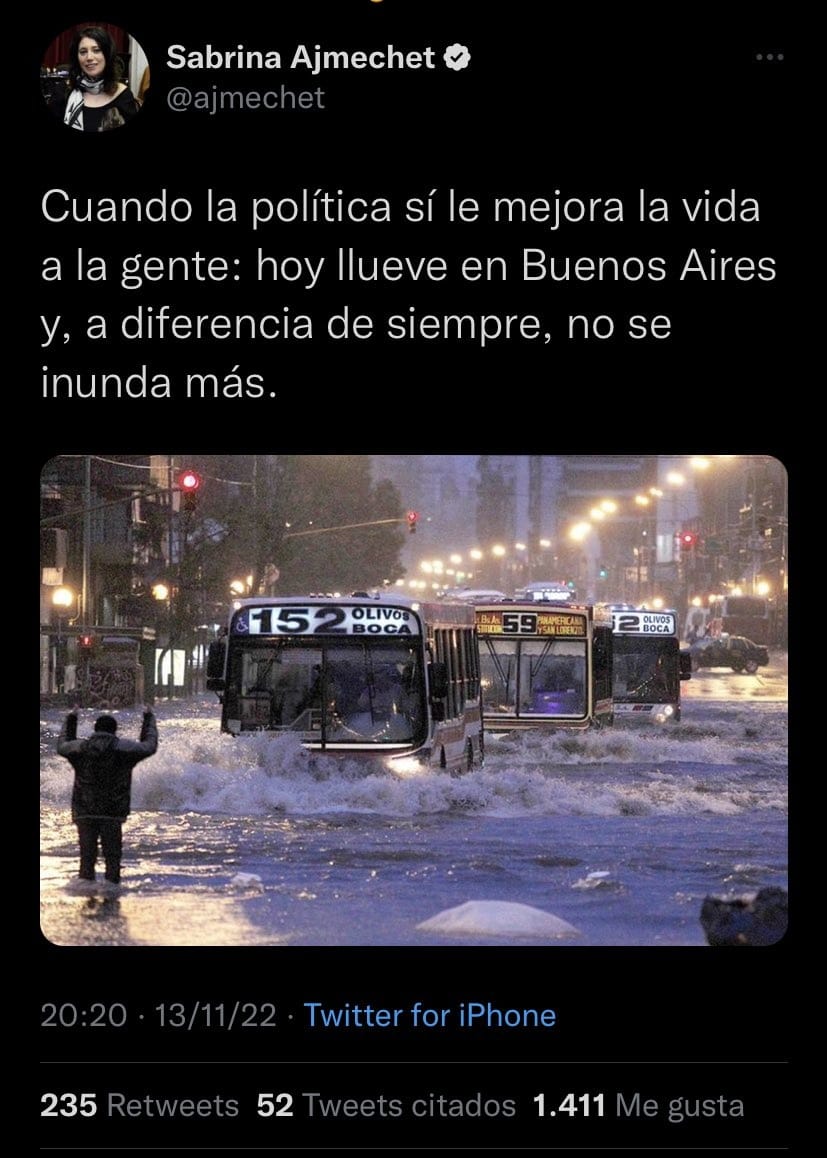 A través de Twitter, expresó con ironía que «la política le cambia la vida a la gente» y que las calles porteñas, a diferencia de antes, «ya no se inundan más», parafraseando al expresidente Mauricio Macri.
