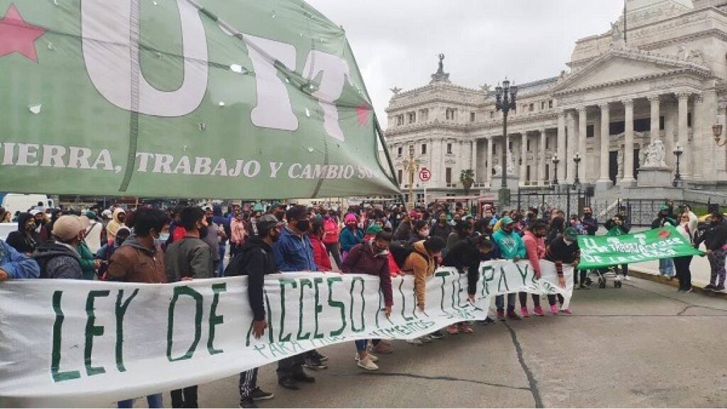 Este lunes la Unión de Trabajadores y Trabajadoras de la Tierra (UTT) inició un acampe de 48 horas frente al Congreso Nacional para exigir el tratamiento de la ley de Acceso a la Tierra, entre otros reclamos propios del sector.
