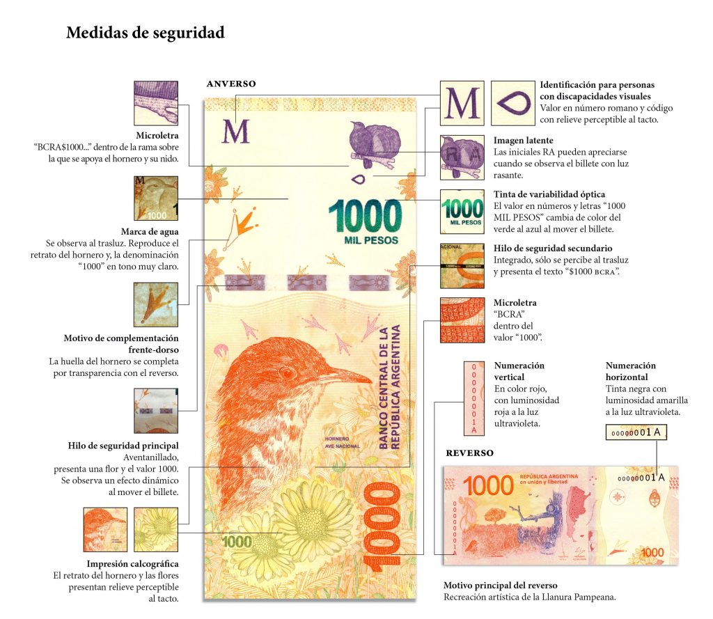 Entre las principales medidas de seguridad del nuevo billete, se destacan en el anverso, la marca de agua, que reproduce el retrato del hornero y presenta, el hilo de seguridad principal cuenta con una banda aventanillada de color marrón y un hilo de seguridad secundario, una fina banda integrada que puede verse al trasluz.